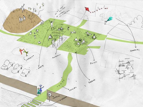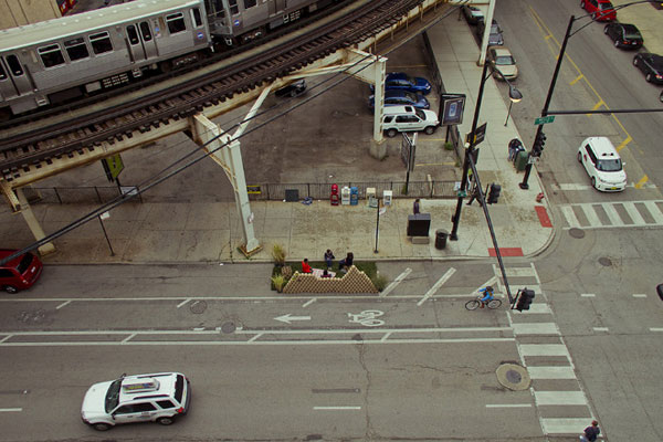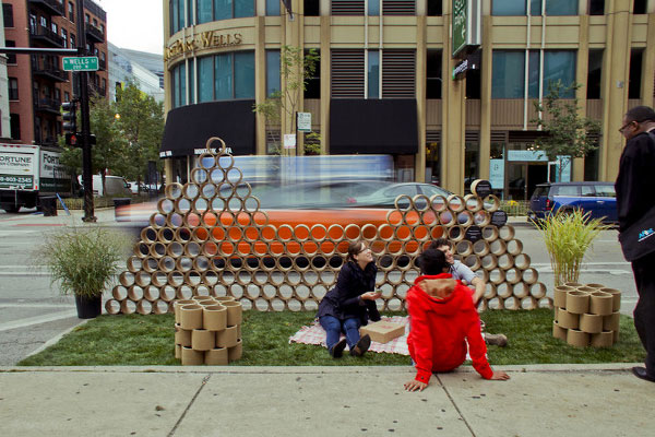 Nas ruas de Chicago, Percino montou a praça temporária com tubos de papel reciclados e gramado sintético, criando assim uma divisão entre a rua e a praça.